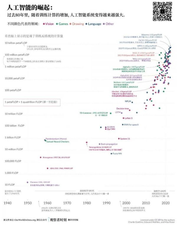 下面这张图显示了过去80年里,人工智能训练量的惊人增长。其中,1petaFLOP等于每秒进行1千万亿次的数学运算。如果一台计算机每秒执行1次计算,那么1petaFLOP需要这台计算机不停计算3170万年。