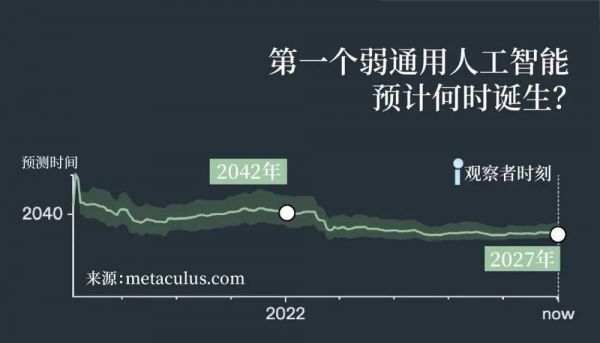 (这是一项来自metaculus网站的民众投票。数据显示,2022年时人们预测AGI会在2042年实现,而2024年时这个数据提前至2027年)