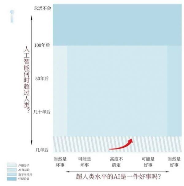 未来生命研究所的创始人麦克斯·泰格马克,根据每个人对AI的信念,画了一个坐标系。在这张图里,你也可以看看自己属于哪个阵营:
