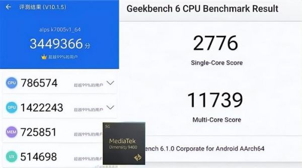 全大核设计对于手机性能的提升非常明显,天玑9400除了在安兔兔跑分高达345万,在GeekBench 6的测试中,天玑9400同样取得了单核2776分,多核11739分的好成绩,相较于上一代单核成绩提高约23%,多核成绩提高约52%。