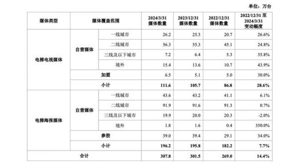 2022-2024年第一季度,分众传媒在三线及以下城市的电梯电视媒体数量分别为5.3万、6.4万、7.2万台,期内变化幅度达35.8%。传统的电梯海报媒体数量则为20.3万、20.0万、19.9万台,略有萎缩。