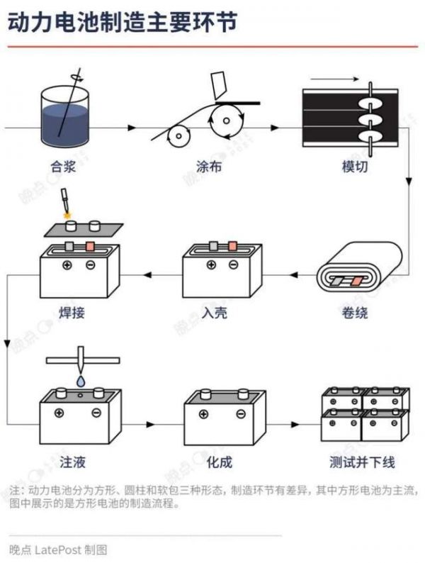 目前动力电池生产的大致流程是把糊状的正负极材料涂在箔片上做成极片,然后卷成极卷放入电池壳中、注入电解液、焊接完成。