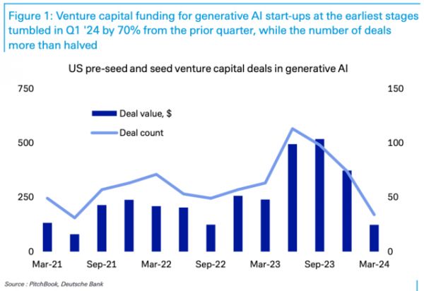 德意志银行的最新报告显示,2024年第一季度,美国生成式AI初创公司的种子轮和早期融资总额仅为1.23亿美元,较上一季度暴跌超过三分之二。融资交易数量也从上一季度的70多笔锐减至34笔。