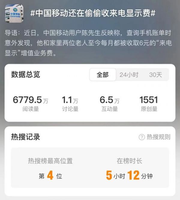 (图源:微博热搜)按照中国移动的官方说法,自2016年4月1日开始已经全网停止销售「来电显示」服务,也就是说,这位发声的博主因一个早就被取消的服务白白收取了8年的费用,也的确是让人十分费解。