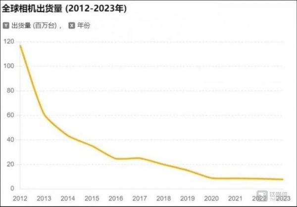 2007年后,相机市场依然在持续扩张,到2012年,其全球年出货量已经突破1.17亿台,但相机也没能逃过“盛极必衰”的命运。从2012年末开始,相机市场经历了平均每年减少18%出货量的快速下跌,直到2020年止跌,至今也都只是维持在年出货量800万台左右的水平。