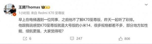 Redmi品牌总经理王腾今早发微博称:“早上在电梯遇到一位同事,之前他不了解K70至尊版,昨天一起听了彩排。他跟我说感觉K70至尊版就是大号版的小米14,很多规格都差不多,部分地方如性能、续航更强,大家觉得呢? ”
