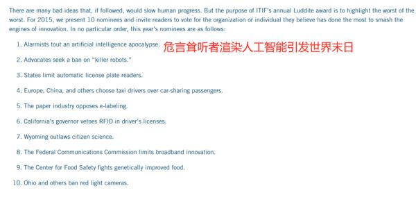 2015年的卢德奖,“人工智能引发世界末日”这种论调喜获提名,虽然颁奖者没有直接点名,但马斯克和盖茨不久前才发表了类似的言论,很显然这奖是奔着他们去的。
