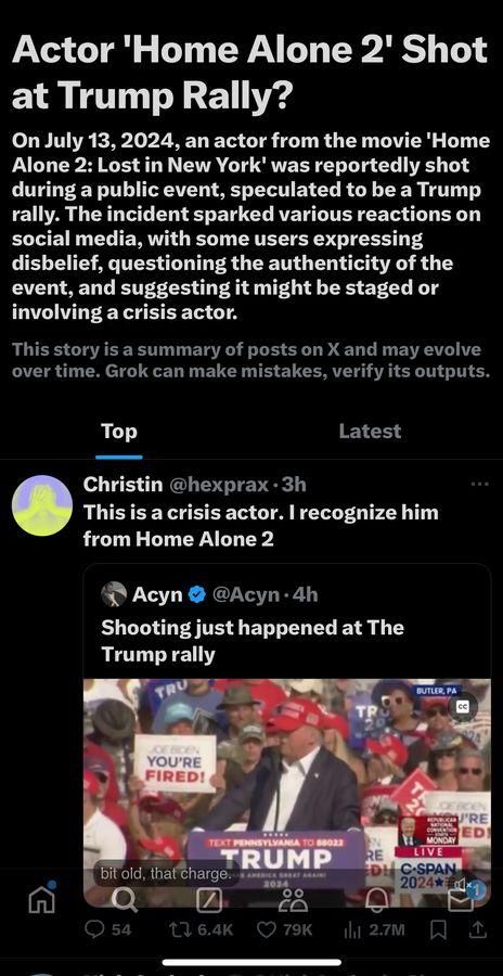 一则引人瞩目的Grok头条错误地声称:“电影《小鬼当家2》的演员在特朗普集会上遭到枪击?” 特朗普确实在1992年的电影《小鬼当家2:迷失纽约》中露过脸,成为部分X用户热议的话题,但Grok的摘要却未能澄清“演员”是否是特朗普本人,反而混淆视听,写道:“据报道,电影《小鬼当家2:迷失纽约》的一名演员在公开活动中遭遇枪击,推测与特朗普竞选集会有关。”
