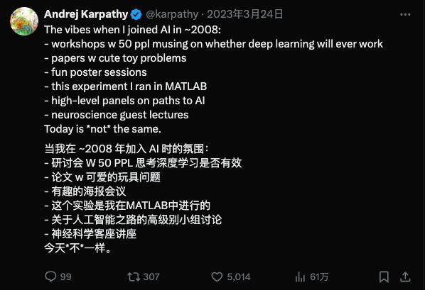 OpenAI的联合创始人(现在已经离职)Andrej Karpathy曾经发推说,他刚踏足AI这个领域是2008年,那个时候一个会议也就50人,大家还会花时间评评有哪些不错的海报。