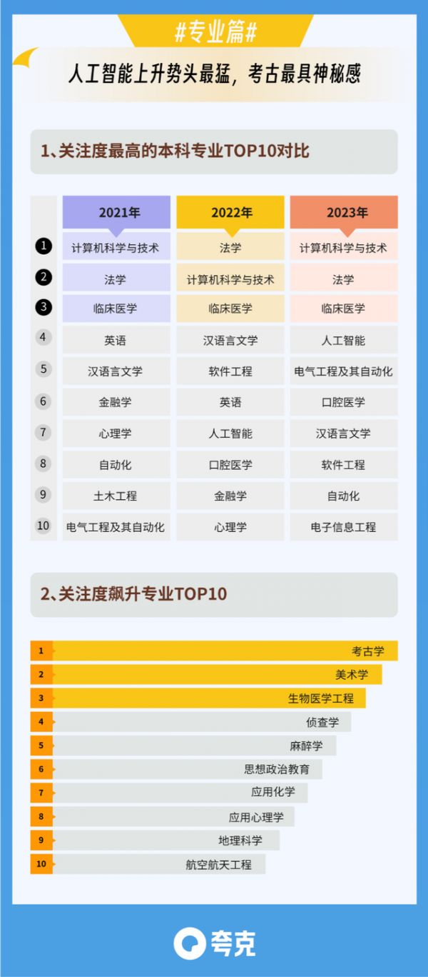人工智能在给就业市场带来巨大变化,并且直接影响到了大学专业选择的趋势。夸克App发布的《2023高考志愿报告》中显示,计算机科学与技术占据第一,排名前十的专业里,也以人工智能相关专业为多。