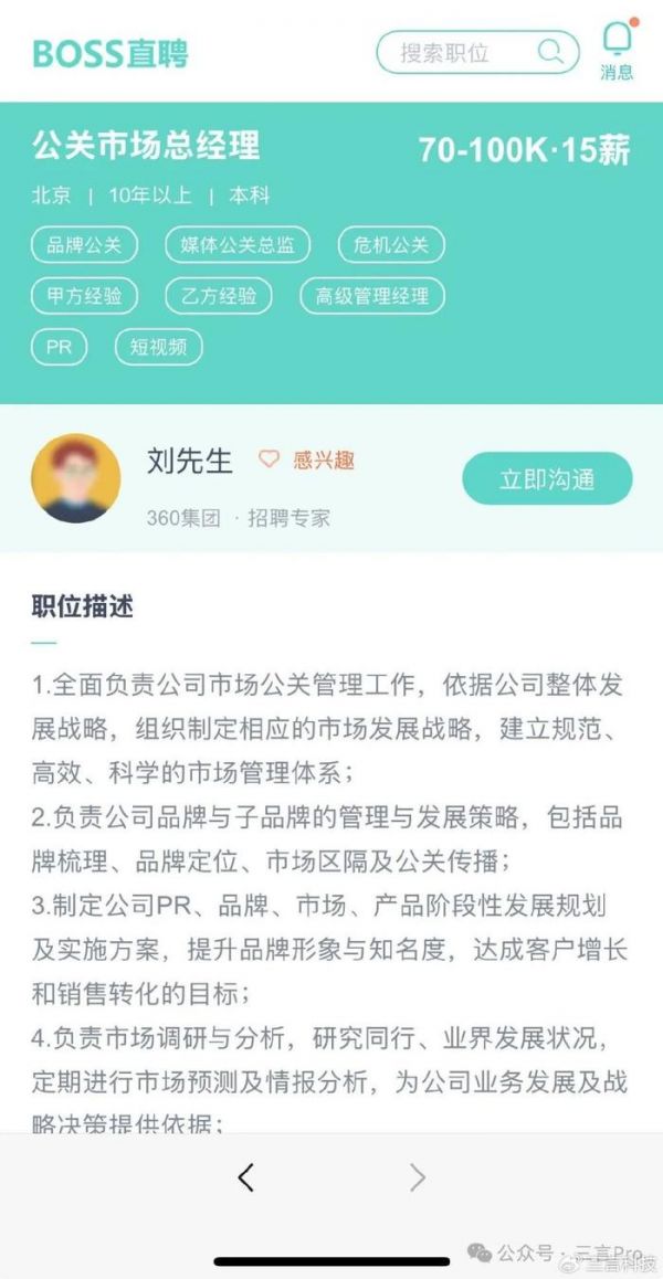 此外,招聘平台显示,360目前正在招聘公关负责人,月薪7-10万。