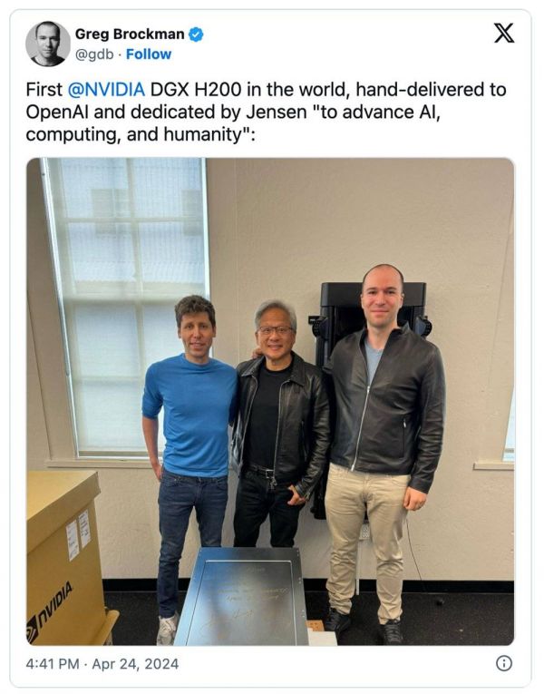 ▲英伟达CEO黄仁勋亲自向OpenAI交付首批DGX H200芯片时,OpenAI总裁Greg Brockman发布了一条推文