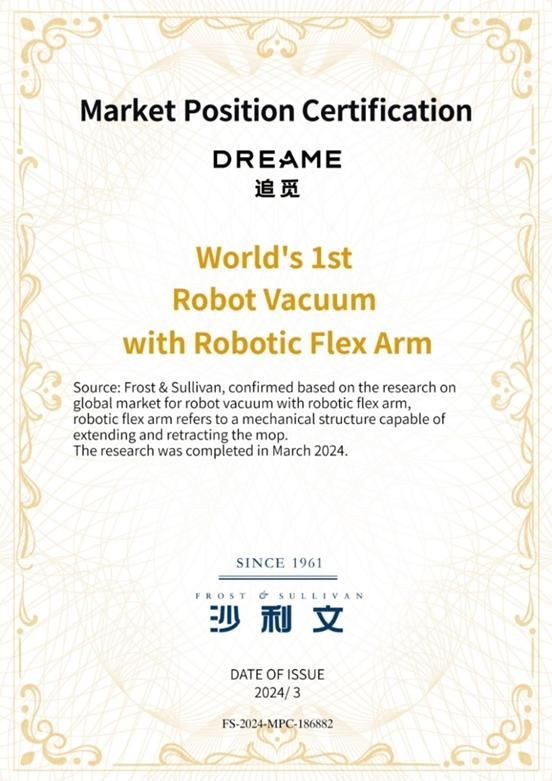 追觅科技的技创新性得到了国际知名认证机构弗若斯特沙利文的认可。在2024年5月的新品发布会上,沙利文为追觅科技颁发了“全球扫地机器人仿生机械臂首创者”和“全球20万转/分钟高速数字马达首创者”两项认证,肯定了其在智能清洁家电行业的领导地位和成就。