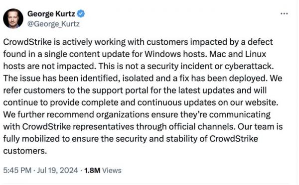 CrowdStrike首席执行官George Kurtz下午也在社交平台表示,这不是一起安全事件或网络攻击,相关问题已被识别、隔离,并已部署修复方案。