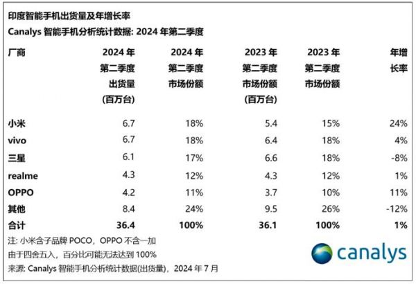 7月18日消息,Canalys发布数据,2024年第二季度,在印度大选、季节性需求低迷以及部分地区极端天气等各种因素的影响下,印度智能手机市场微增1%,总出货量达3640万台。