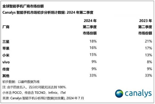 2024年Q2全球智能手机市场份额排名揭晓