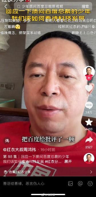#周鸿祎回应质问百度总裁的少年# 周鸿祎回应质问百度总裁少年:指责别人容易,做出相应技术是不容易的。