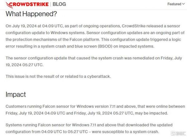据CrowdStrike官网发布的说明,7月19日,CrowdStrike向Windows系统发布了传感器配置更新,从而触发了逻辑错误,导致受影响的系统崩溃和蓝屏。