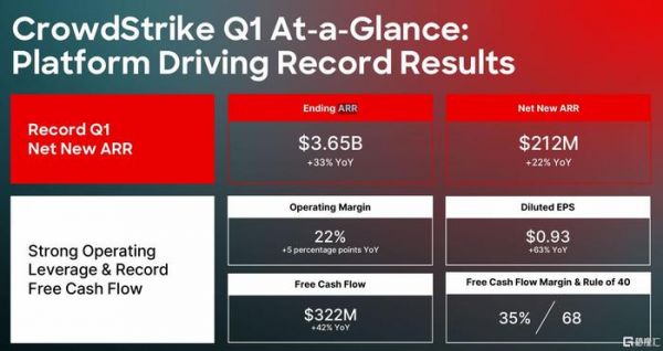 Crowdstrike的基本面不错。2025财年一财季, Crowdstrike收入为9.21亿美元,同比增长33%;非GAAP每股摊薄净收入为0.93美元,同比增长63%。