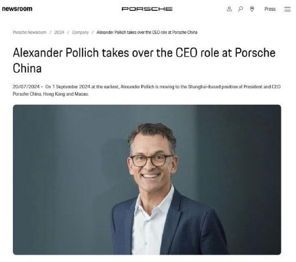 7月20日,保时捷官网显示,亚历山大・波利奇(Alexander Pollich)最早将于今年9月1日出任保时捷中国 CEO,接替前任迈克尔・科尔施的职位。