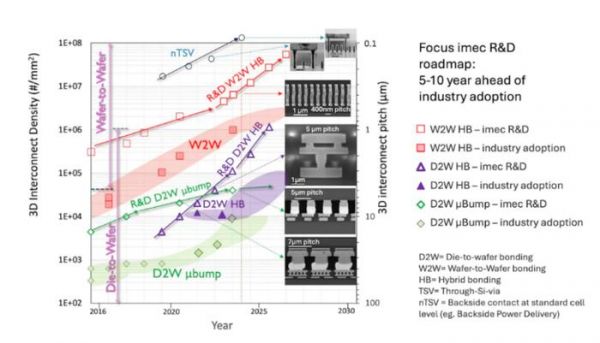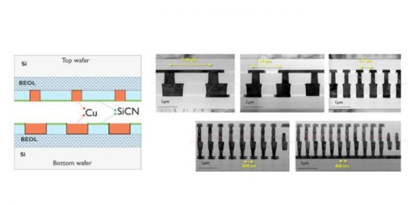图3 芯片对芯片的混合键合是实现亚微米级互连密度三维片上系统(3D-SoC)集成的关键技术。Imec采用SiCN作为键合介电层的专有方法,使互连间距缩减至400纳米。