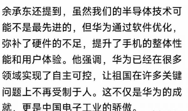 余承东还称:“虽然我们的半导体技术可能不是最先进的,但华为通过软件优化,弥补了硬件的不足,提升了手机的整体性能和用户体验。华为已经在很多领域实现了自主可控,让祖国在许多关键问题上不再受制于人。这不仅是华为的成就,更是中国电子工业的骄傲”。
