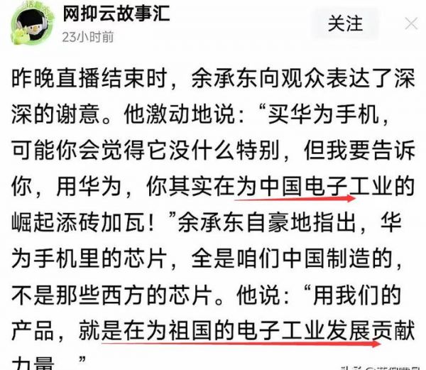 老余称:“买华为手机,可能你会觉得它没什么特别,但我要告诉你,用华为,你其实在为中国电子工业的崛起添砖加瓦!华为手机里的芯片,全是咱们中国制造的,不是那些西方的芯片。用我们的产品,就是在为祖国的电子工业发展贡献力量”。