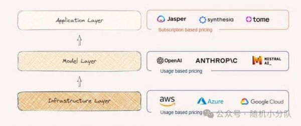在 LLM 领域和基础设施层,基于使用量进行定价的模式自商业化以来一直是非常常见。大多数公司按 token 数量收费,这与计算成本密切相关。我们调查了 40 家领先的 AI-Native 公司在应用层面的定价情况,下图可以看到不同 AI 层公司的情况,本文的重点是顶层——AI-Native 应用。