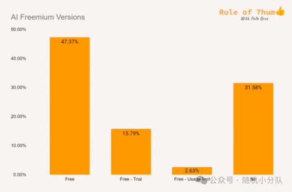 在研究的 AI 应用中,大约 70% 存在某种形式的 Freemium 模式,所观察到的三种 Freemium 模式是: