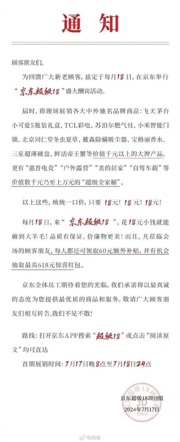 自7月起,京东将在每月的17日晚上8点至18日全天,推出一系列精选商品,以远低于市场价的18元超低价格销售,这些商品涵盖了从高端白酒到家电、家居用品以及电子产品等众多品类。