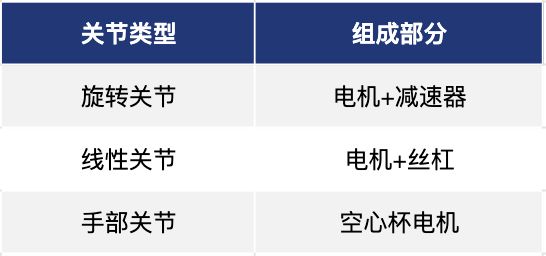 这一优势并不仅仅体现在丰富训练场景,更在于对非标准化的核心零部件的自主掌控力。如果类比人来看,人形机器人的运动主要分为两类——线性运动和旋转运动,所涉及的关节和相关的组成有三类,这三类关节主要由电机、减速器和丝杠三个核心部件组成: