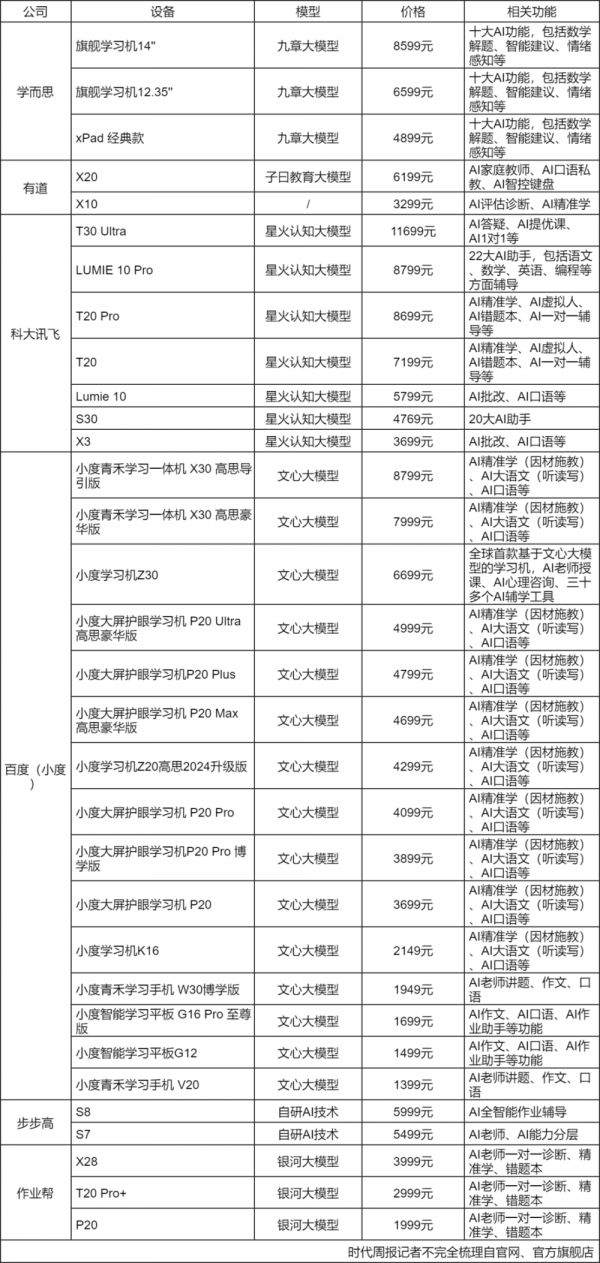 但据时代周报不完全统计,搭载AI功能的学习机大多价格在5000元以上,几家厂商的旗舰级学习机价格接近9000元,而内置星火大模型科大讯飞AI学习机新品T30 Ultra,其12GB+1TB版本价格上万。