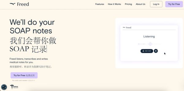 在语音转文字方面,首先是 Freed AI 。Freed 为医生做 SOAP 笔记。根据推特上的@ErezDruk ,该公司在一年内达到了 1000 万美元 ARR。临床医生通过使用 Freed,每周节省数小时——他们不再需要在周末和晚上撰写预约报告。
