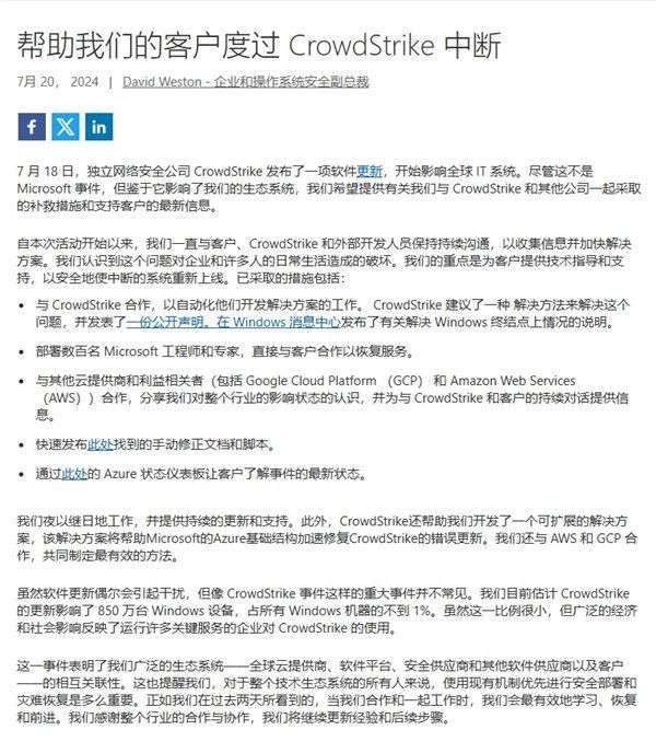 “尽管这不是微软造成的事件,但鉴于它影响了我们的生态系统,我们希望提供有关我们与CrowdStrike 和其他公司一起采取的补救措施和支持客户的最新信息。 ”