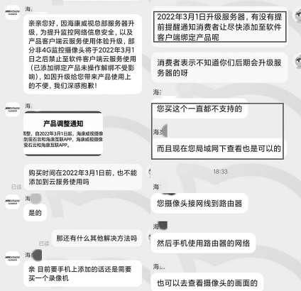 海康威视旗舰店客服人员与钟先生6月13日的聊天记录显示:“因海康威视总部服务器升级,为提升监控网络信息安全,以及产品客户端云服务使用体验升级,部分非4G监控摄像头将于2022年3月1日之后禁止单独添加至软件客户端云服务使用(已添加绑定产品未操作解绑不受影响)。”钟先生告诉记者,客服人员给他推荐了一款录像机,折后价332元。钟先生不想再买录像机,提出要店铺免费提供录像机,或更换同类可以使用的产品,或退货退款等诉求,均被对方拒绝。