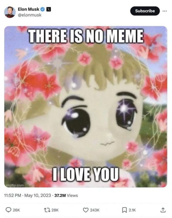 2023 年 5 月 10 日,埃隆·马斯克发布了一条带有 Milady 表情包的推文,表情包的文字内容为‘ There is no meme , I love you .(没有 Meme ,只有我爱你)’。( Odaily 星球日报注:该图片左下角水印为某表情包网站 imgfli . com )。