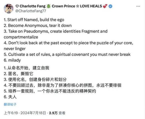 值得一提的是, Charlotte Fang 本人日常发布的推文内容画风就颇为清奇,看得出来,他对在网络上获取注意力已经轻车熟路,颇为熟稔,而每一条推文看起来也像是 Milady 社区的‘狂热宣言’。