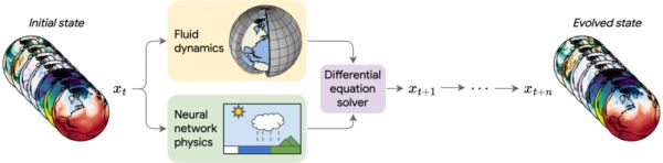 图|NeuralGCM 模型架构。NeuralGCM 结合了传统的流体动力学求解器和用于小尺度物理的神经网络。这些组件由微分方程求解器组合而成,在时间上依次向前推进系统。(来源:Google Research)