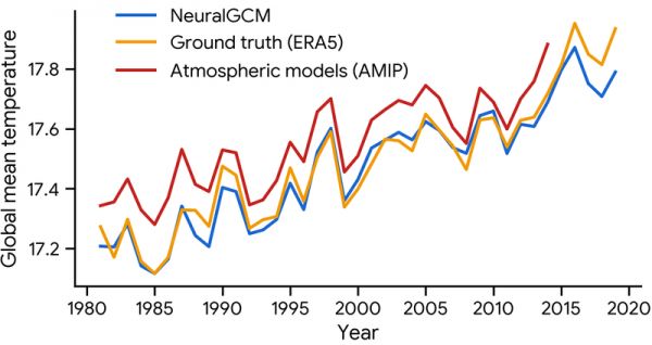 图|NeuralGCM 在十年时间尺度上的准确性和捕捉全球变暖的能力。NeuralGCM 和 AMIP 在预测 1980 年至 2020 年全球平均气温方面的表现比较。(来源:Google Research)