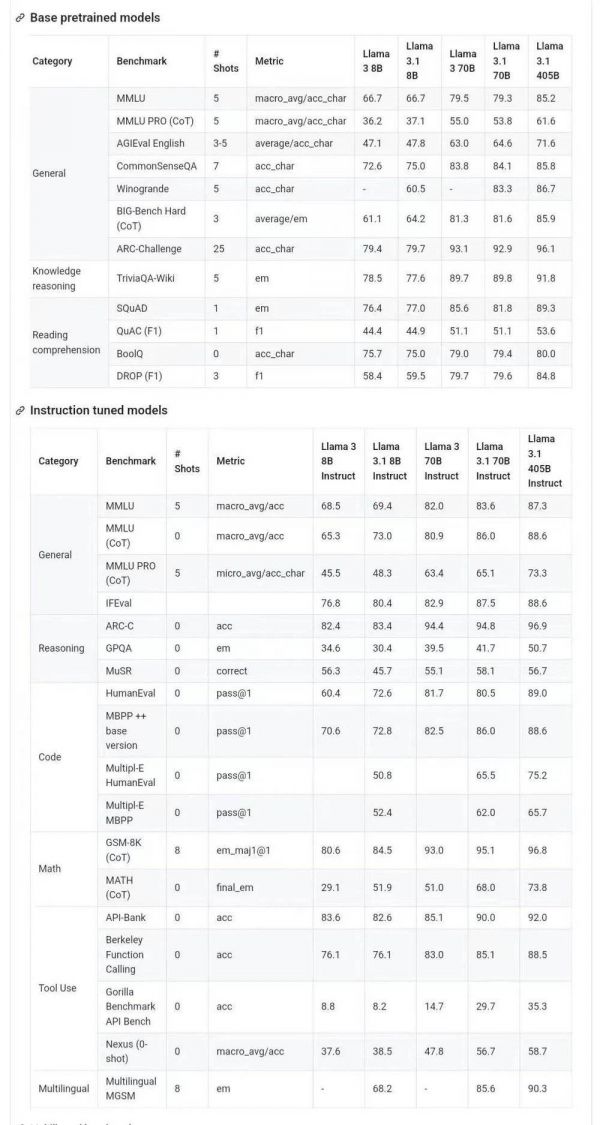 显然,3.1版本的8B和70B模型是由405B蒸馏得来的,因此相比上一代有着明显的性能提升。