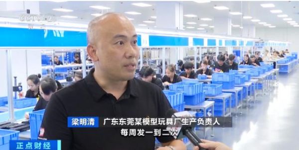 广东东莞某模型玩具厂生产负责人 梁明清:现在海外市场每周发货一两次,每一次发两三个柜。现在是24小时人停机不停的状态,订单已经排到今年12月份,生产的能力还是不能满足整个市场。