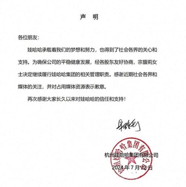 而根据最新的媒体消息和娃哈哈的公告,宗馥莉将继续履职娃娃哈,重新带领娃哈哈团队征战快消品市场。