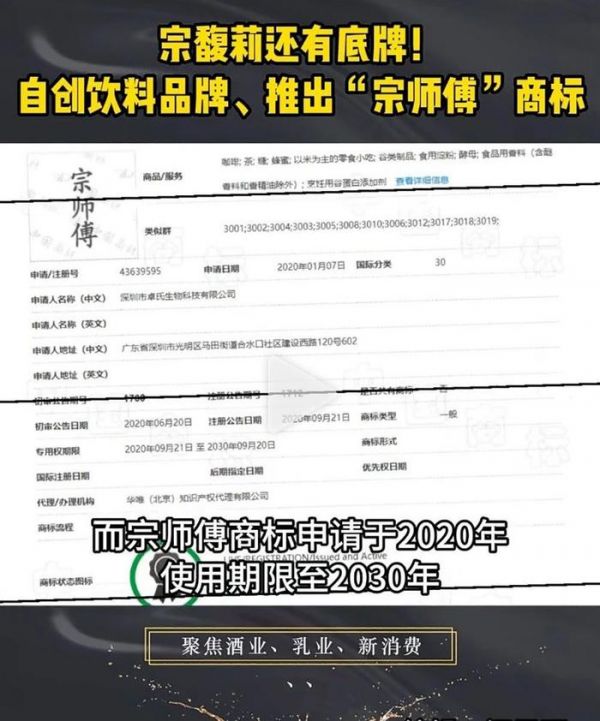 比如媒体近期就披露啊,宗馥莉一口气注册了五个新商标,其中最吸引眼球的就是“宗师傅”。这个名字听起来就挺有深意的,仿佛预示着她将沿着父亲的脚步,成为饮料界的新一代宗师。