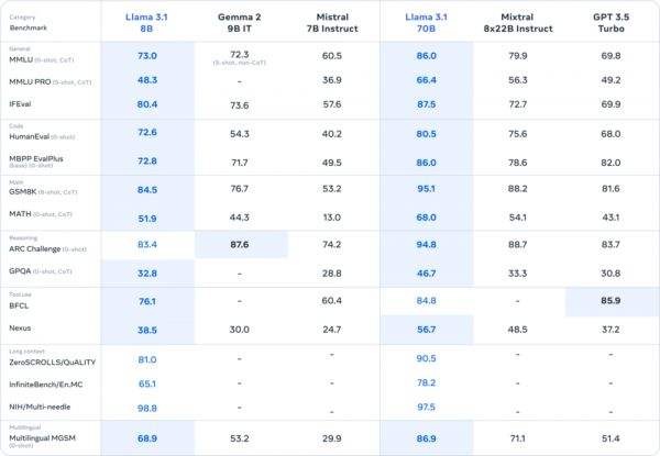 就基准测试结果来看,Llama 3.1 8B几乎碾压了Gemma 2 9B 1T,以及Mistral 7B Instruct,整体性能也比Llama 3 8B有了显著提升。Llama 3.1 70B则越级战胜了GPT-3.5 Turbo。