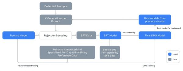 采用了一种迭代后训练程序,每一轮都使用监督微调和直接偏好优化。这使得研究团队能够为每轮创建最高质量的合成数据,并提升每项功能的性能。