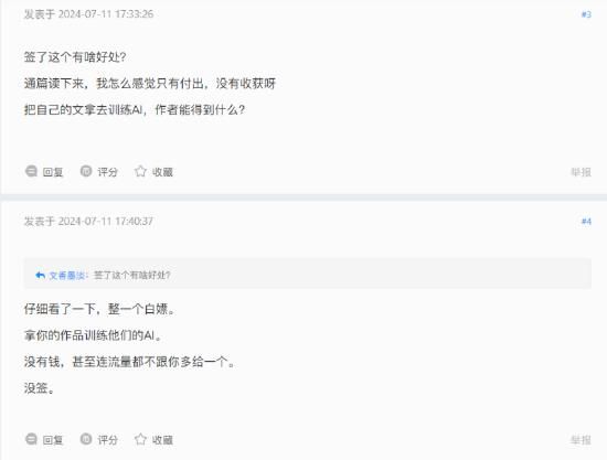 对于这样的一份协议,大部分作家表达了强烈抵触。在某论坛上,大量的网文读者和作家涌入评论区,一致认为这是典型的“白嫖”,直言辛辛苦苦写了百万字,“现在让我们把成果去‘投喂’AI?”。