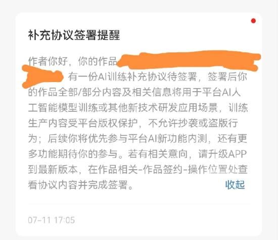 7月上旬,陆续有番茄小说作家在小红书、龙的论坛等平台发布消息称,自己收到一则番茄小说发出的系统通知,提醒自己有一份作品的AI训练补充协议需要签署,“签署后作品全部/部分内容及相关信息将用于平台AI模型训练或其他新技术研发场景,训练生产内容受平台版权保护,不允许抄袭或盗版行为。”