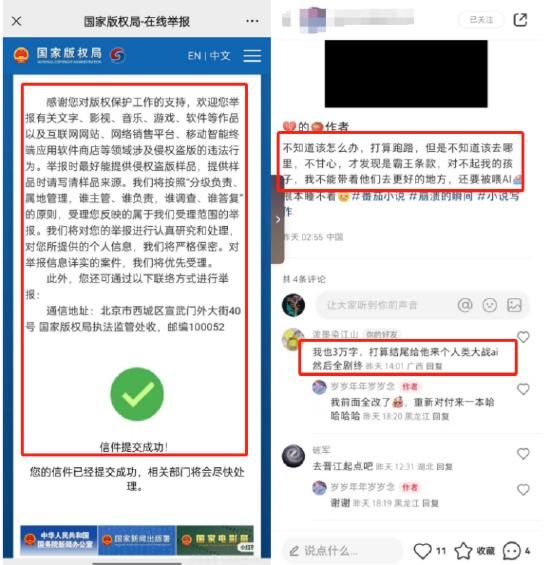 在一些作家看来,番茄小说这样的做法,“就是为了掠夺本该爆火作家的气运”“斩断作家未来的路”。目前,多位作家已经先后就版权问题向12315等有关部门发起投诉,有的甚至直言停更,即将退出番茄小说。