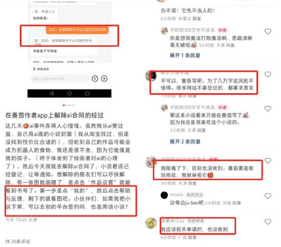 不过目前,多数作家并不买账。在一些作家看来,“虽然已经申请进行解除AI协议,但目前还没有收到正式的解除通知,不知道何时能确认解除。”另有一些作家认为,“客服虽然说已经删除协议,但公司迟迟未能发布删除AI协议的公告,客服单方面说法可信度较低。”