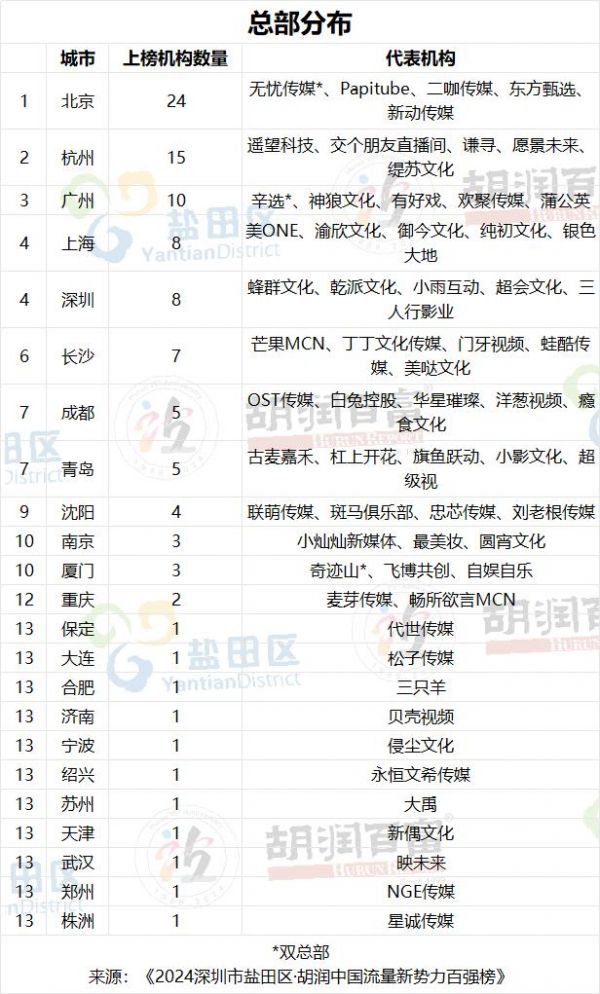 《胡润流量新势力百强榜》中,超六成机构位于北京、杭州、广州、深圳和上海这五大城市,从省份来看,广东位居全国第二。